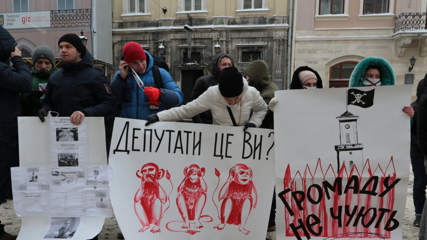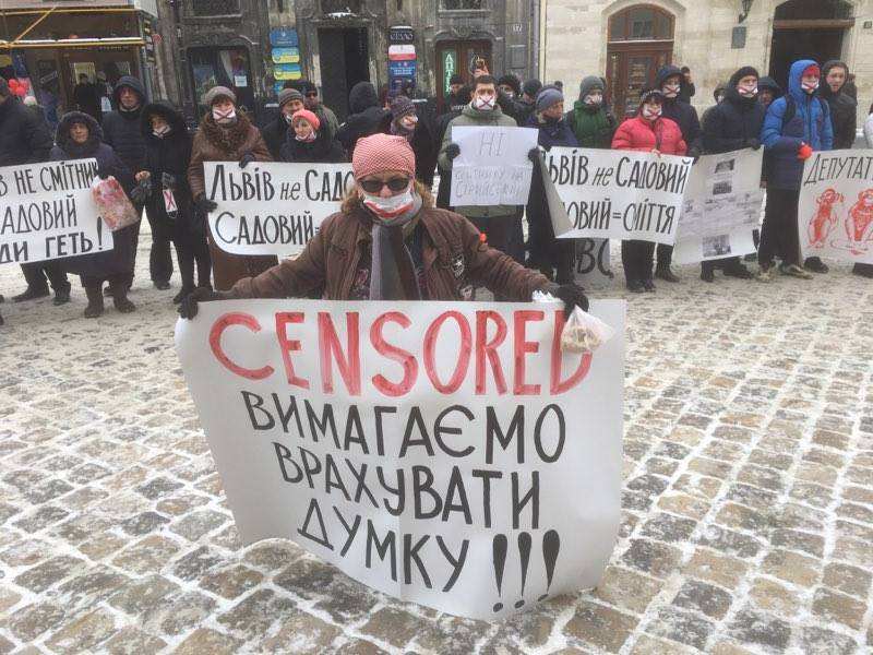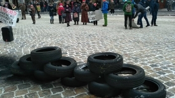 Активисты принесли под Ратушу автомобильные шины и бочки, а также плакаты с надписями: «Общественность не слышат», «Львов не помойка», «Требуем учесть мнение» и другое.