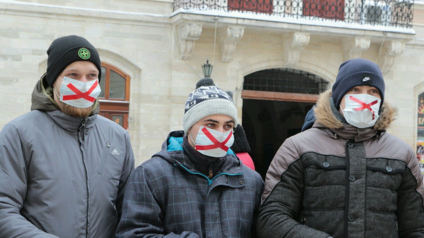 Многие протестующие скрывают свои лица платками и медицинскими масками. Кроме того, неизвестные повредили камеру наблюдения на площади Рынок.