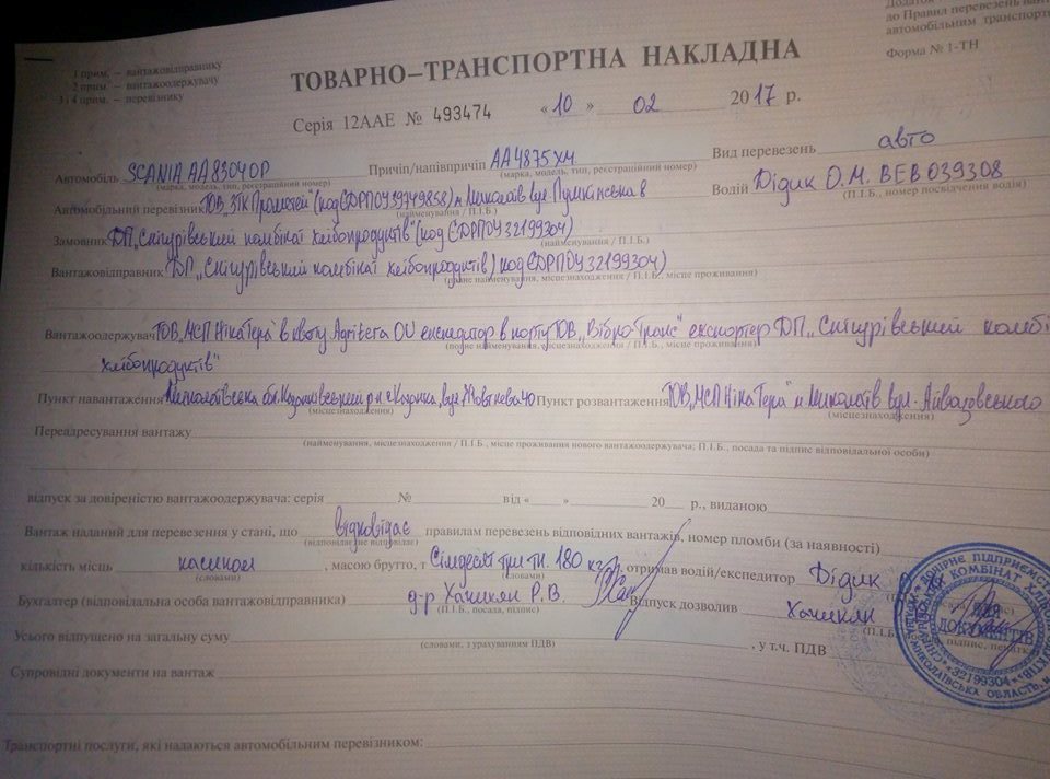 — Что там у нас было про давление на бизнес? Что там про Николаевскую область в негативе? Вчера в Кировограде были составлены акты на три грузовика. У каждого вес брутто около 70 тонн. Вот один - Скания, вез кукурузу. Автомобильный перевозчик - Прометей. Заказчик ДП «Снигиревский КХП», грузополучатель ТОВ Ника-Терра. Вес - 73 тонны 180 килограмм. Директор Хачикян Р.В. - выпуск разрешил (и подпись). После актирования водители устроили скандал и уехали. Да, по нашей Н-14. Да, в нашу область, - сказано в сообщении.
