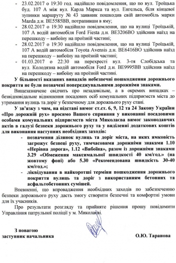 За последние недели 2017 года на территории Николаева произошло 6 ДТП из-за выбоин на дорогах. Управление патрульной полиции просит мэрию Николаева провести ремонт дорожного покрытия и обозначить аварийноопасные места специальными знаками.