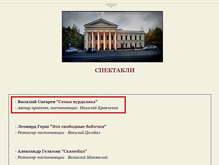1 марта текущего года в николаевском русском театре состоялась премьера спектакля «Семья вурдалака», посвященного проблеме наркомании. Несколько месяцев эту постановку готовил режиссер театра Виталий Манжелий, однако в день премьеры на буклетах в графе автор и постановщик было указано имя директора театра, его художественного руководителя Николая Кравченко.