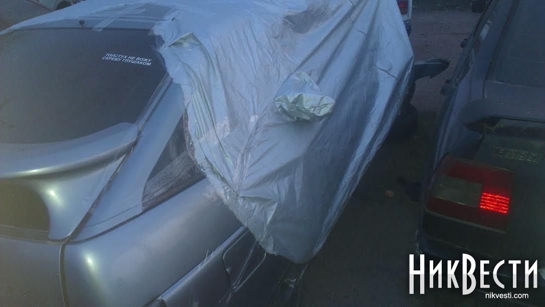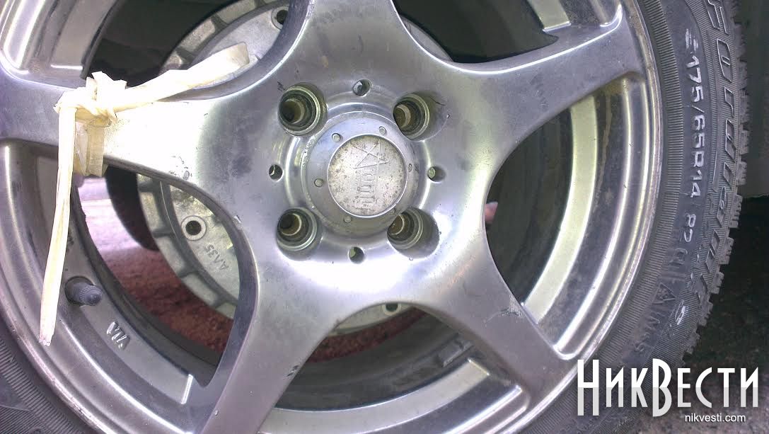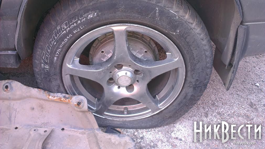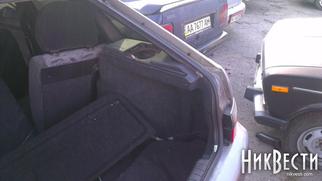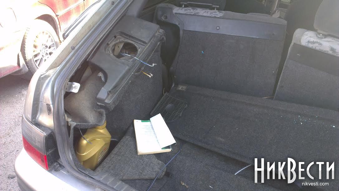 Об этом НикВестям рассказал владелец авто, который и обнаружил пропажу запасного колеса, блока предохранителей, двух динамиков сзади и двух спереди, датчика наклона от сигнализации, камеры заднего вида, монитора, домкрата, плафона освещения салона, крепления регистратора к лобовому стеклу, заднего ремня безопасности с катушкой.