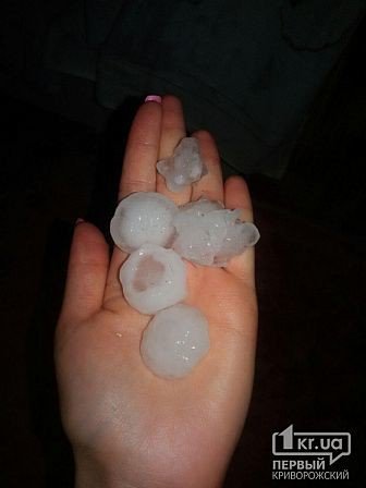 Как сообщает Первый Криворожский, град был диаметром 6-19 мм, местами его размер достигал куриное яйцо.