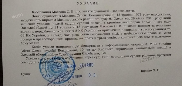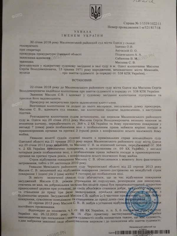 Напомним, в ноябре 2010 года Сергей Маслов и еще два сотрудника милиции были задержаны при получении взятки в размере 4400 долларов США. В итоге Малиновский районный суд Одессы приговорил его к семи годам тюрьмы с конфискацией имущества. Апелляционный суд Одесской области изменил наказание на четыре года лишения свободы. В августе 2013 года Маслов был условно досрочно освобожден.