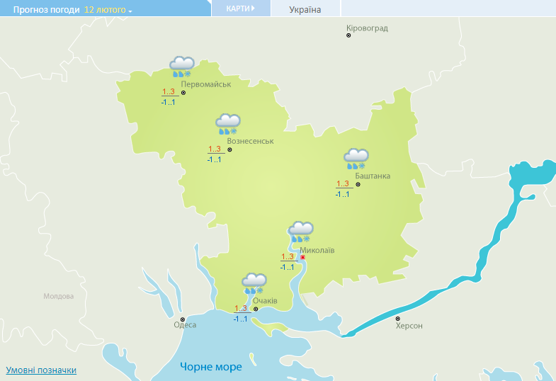 В понедельник, 12 февраля, на Николаевщине температура днем будет от +1° до +5°. Возможны осадки в виде дождя со снегом.