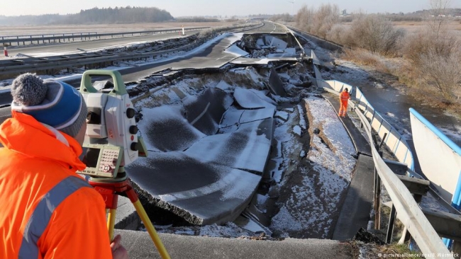 Известно, что этот участок дороги автобана А20 осел еще осенью 2017 года. С тех пор его не ремонтировали, а дыра увеличилась до 95 метров. Выяснить причину проседания дорожного покрытия не удалось до сих пор. Отремонтировать дорогу планируют только к 2021 году.