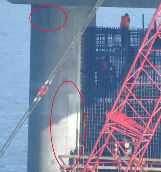 Из 595 опор моста, 256 опора, находящаяся практически посредине Керченского пролива, треснула в двух местах, трещины отчетливо видно на фото, передает Кuresh.info.