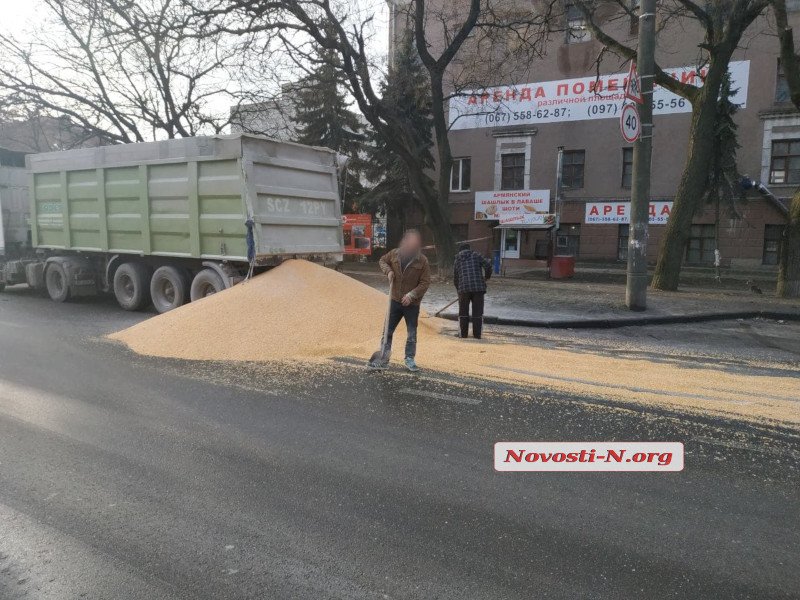Сегодня утром, 5 марта, в Николаеве из полуприцепа седельного тягача DAF на ходу высыпалось более 10 тонн зерна кукурузы.