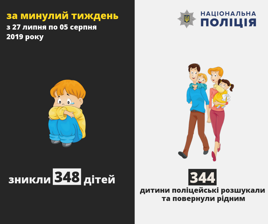 В Украине за период с 27 июля по 5 августа 2019 года пропали без вести 348 детей, из которых нашли 344 ребенка.
