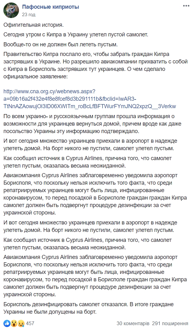 В частности, согласно официальному заявлению государственного учреждения Республики Кипр, 20 апреля из города Ларнака в Киев улетел пустой самолет за гражданами Кипра, которые находились на территории Украины. По пути у него была возможность забрать специальным рейсом CY280 и украинцев с острова.