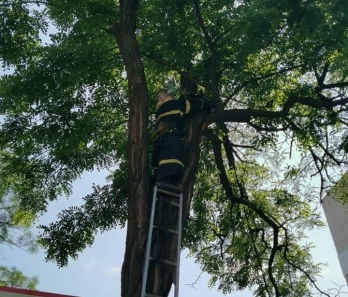 В этот же день пожарным 3 части пришлось снимать с высокой акации на углу улиц Сенной и Декабристов в Заводском районе Николаева пушистого «верхолаза». На ветке его заметили горожане, которые и сообщили об этом на линию «101».