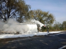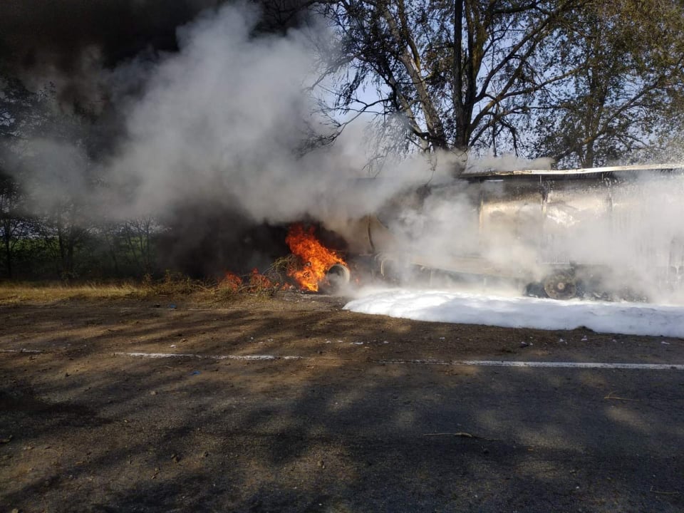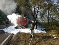 Сообщается, что во время движения у грузовика лопнула шина тягача с пустой цистерной. Автомобиль столкнулся с деревом из-за чего произошло возгорание.