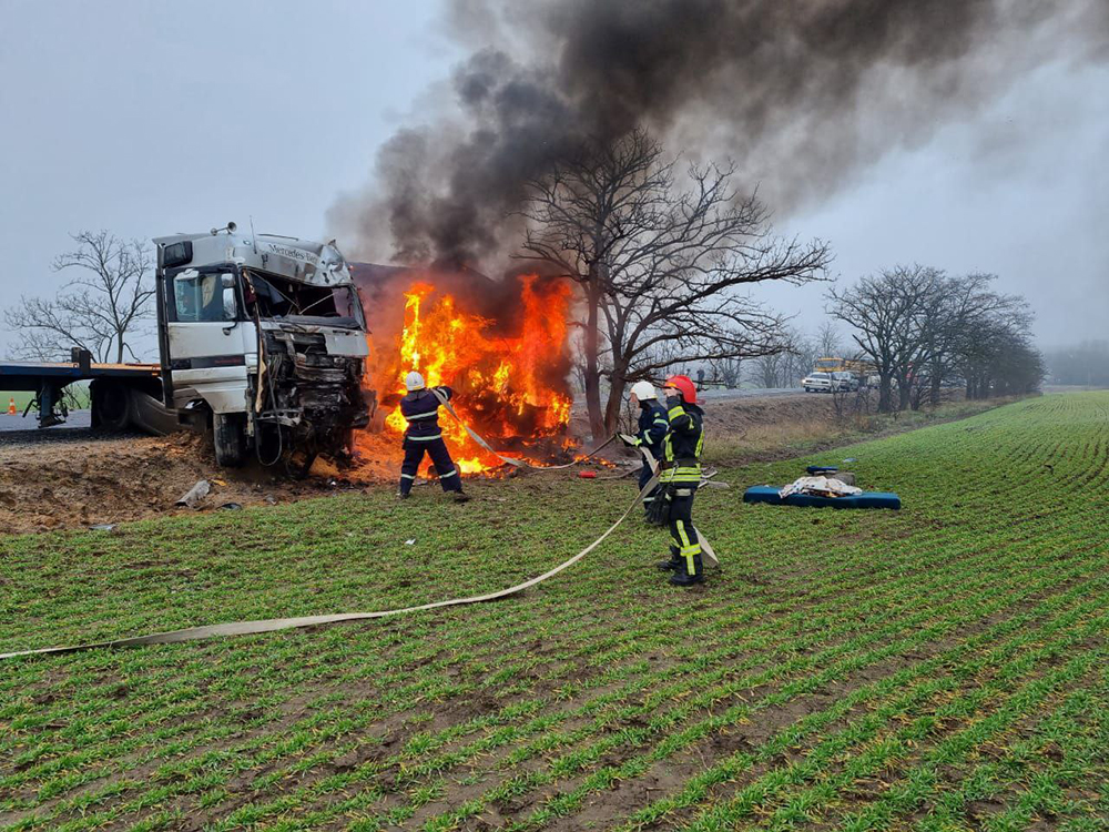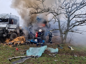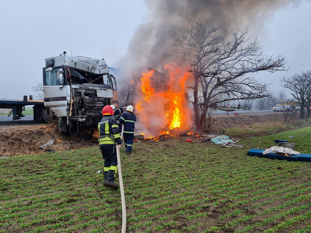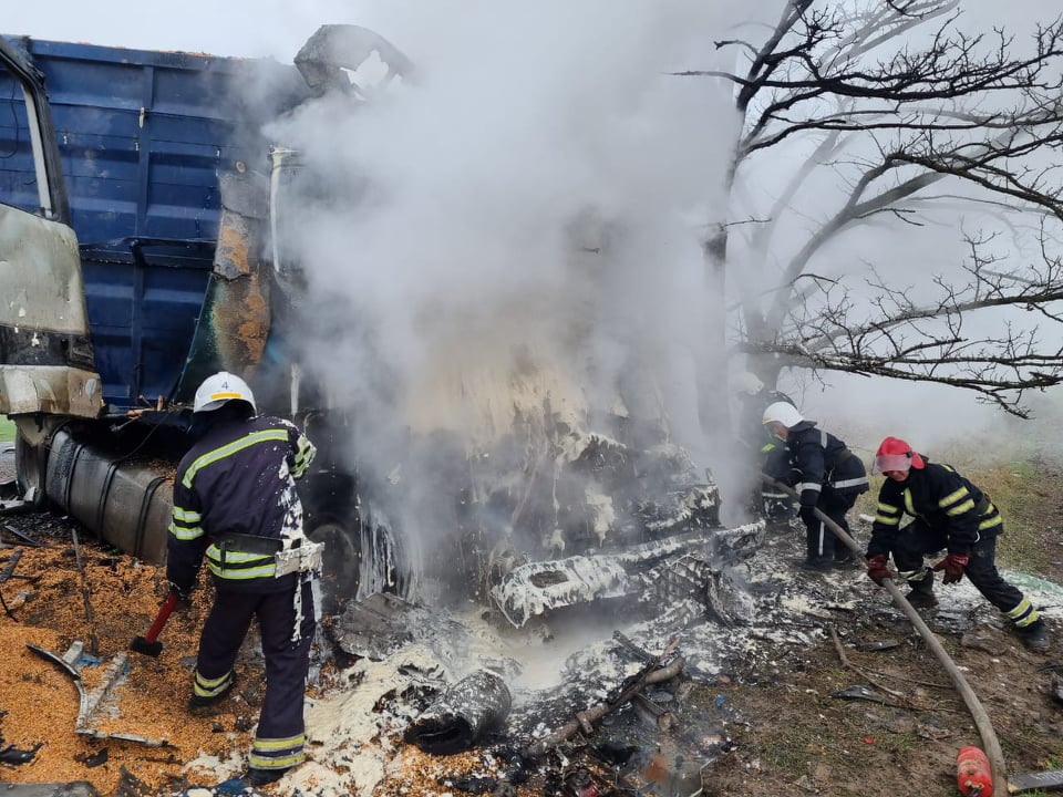 В Николаевской области столкнулись два грузовика — один из них загорелся