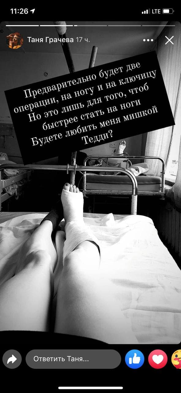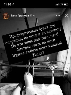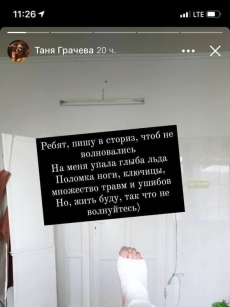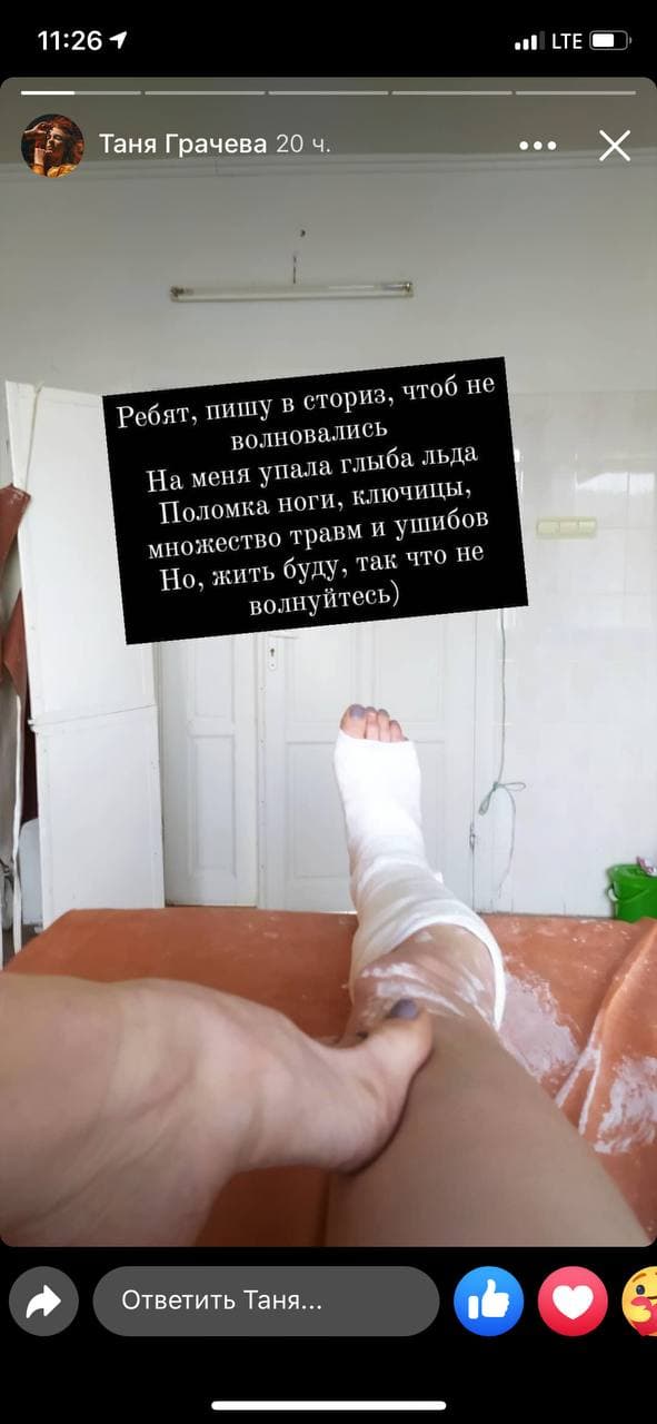 — Лет десять назад, работая журналистом, писала статью о сосульках убийцах, и как от них уберечь башку! Но, видимо, сама ее не прочитала. Очнулась гипс, лежу в больнице скорой помощи в старом корпусе, но с молодым врачом. Перелом стопы, ключицы и множество глупых травм. Но это была не сосулька, а огромная ледяная глыба. Была бы я машина, уже бы не ездила. Иногда мне кажется, я живу в кино. Иногда, что это кино слишком дурацкое, но, нужно быть сильной, смелой, веселой. Хорошо же, что успела спрятать голову? Плохо, что не добежала до своего подъезда три метра, — написала Татьяна Грачева.