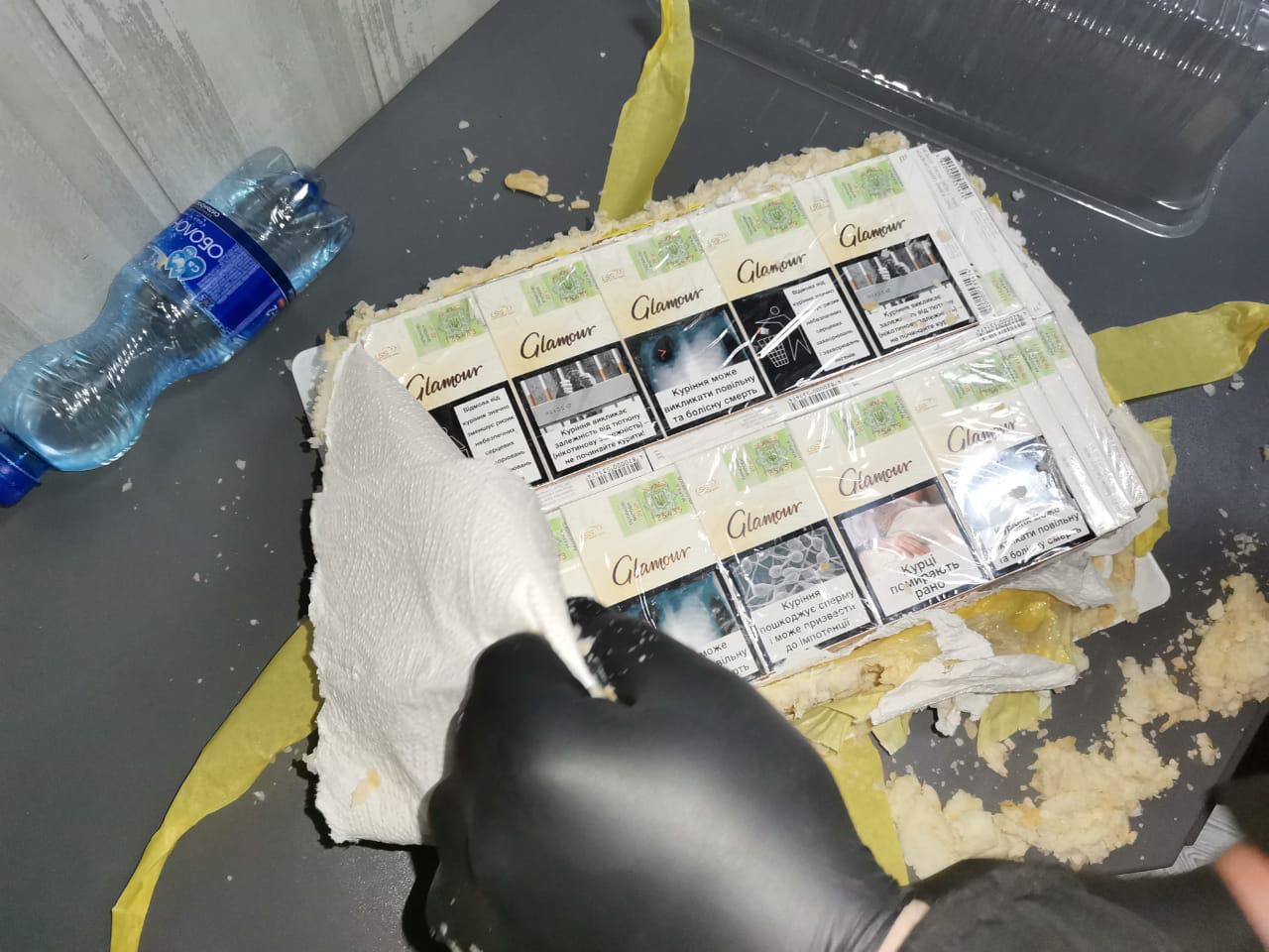 При проверке торта пограничники выяснили, что его основными ингредиентами стали пачки сигарет, которые заменяли в нем коржи. Всего в торт уместились почти 80 пачек сигарет, которые сверху замаскировали заварным кремом с кондитерской присыпкой.