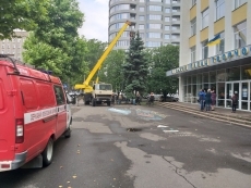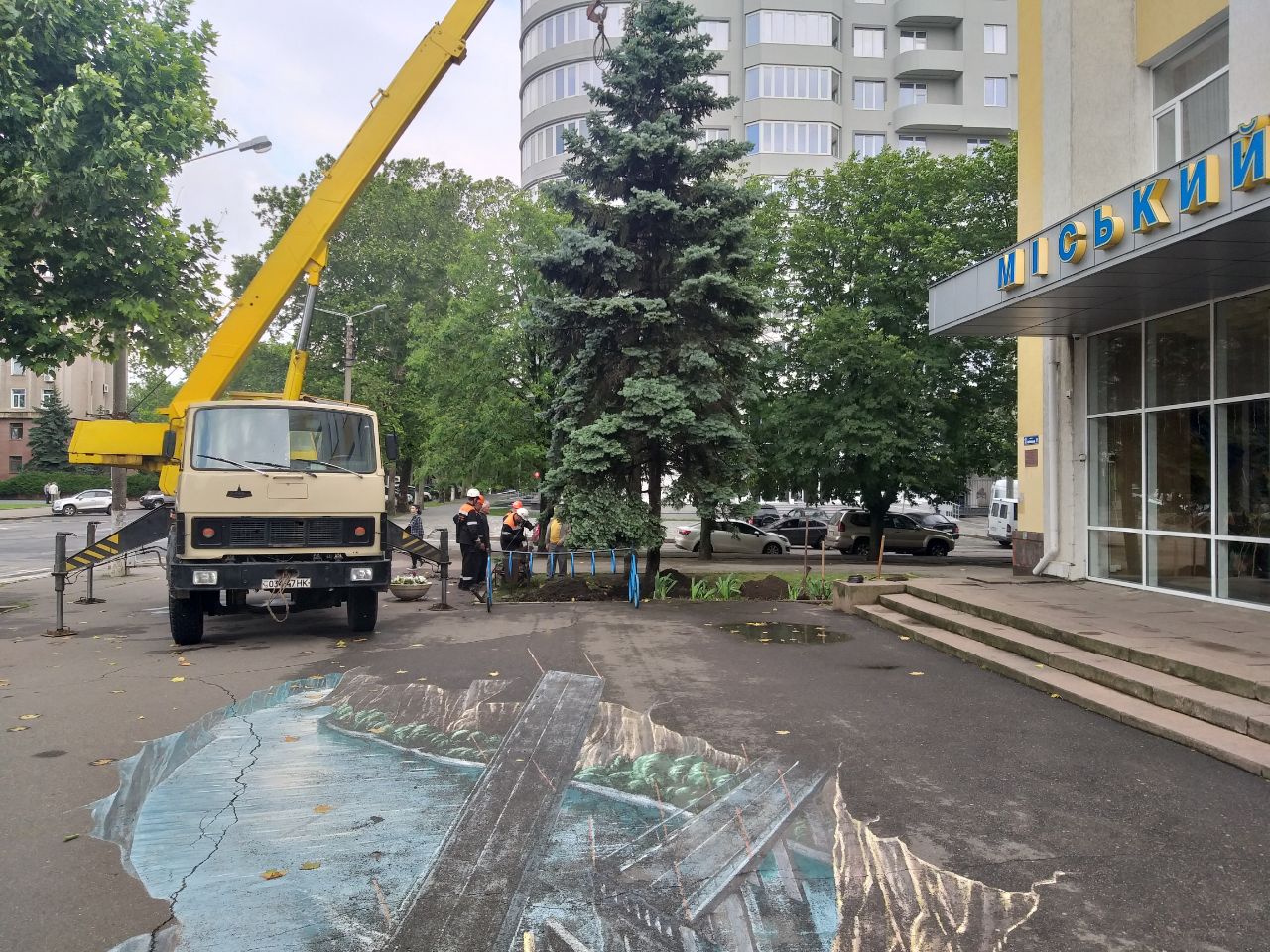 Большая голубая ель упала сегодня утром, 17 июня, около входа во Дворец творчества учащихся. Известно, что ранее хвойное дерево падало в том же месте в апреле 2015 года.