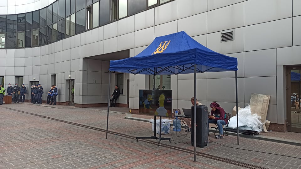 К стенам суда пришли около 50 человек, они поставили палатку, растянули транспарант и установили телевизор.