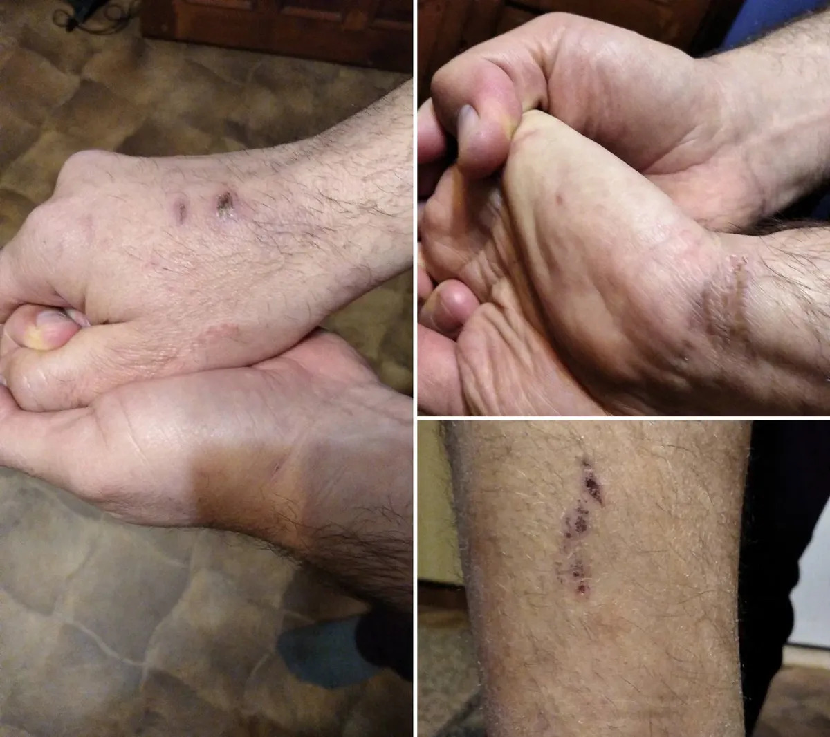 — Меня отвезли в здание Новокаховского городского совета. Меня начали допрашивать: имя, фамилия, дата рождения, место проживания, место работы, «вот ты журналист, зачем ты пишешь про…» Меня про каких-то националистов спрашивали, знаю ли я каких-то националистов местных, про митинги, которые проходили в нашем регионе. После этого меня и нескольких человек отвезли в здание полиции, недалеко от центра города, и об этом я тоже не хочу говорить. То, что еще какие-то задержанные люди вместе со мной, я ощутил только тогда, когда из здания совета нас повезли в здание полиции. Там тоже был допрос, и там других тоже допрашивали. Потом меня и других приковали наручниками к батарее, и до утра я там сидел. <…> Не били по голове, к счастью. По ногам, по спине, по бокам, но куртка сглаживала удары. По ногам было больнее. Очень сильно затягивали наручники, у меня были очень сильно опухшие руки, и до сих пор остались шрамы. Постоянно угрожали убийством, — рассказывает журналист.