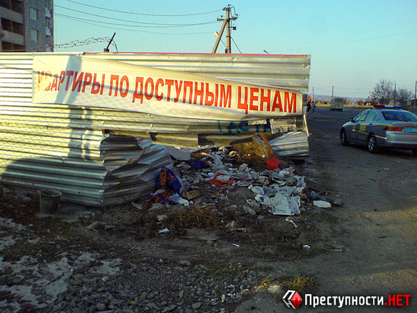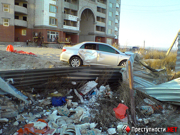 Следы от «заноса» составляют порядка 20-25 метров. По словам работников службы охраны новостройки, в углу заграждения лежало корневище дерева с частью ствола. От удара его откинуло приблизительно на 7-8 метров.