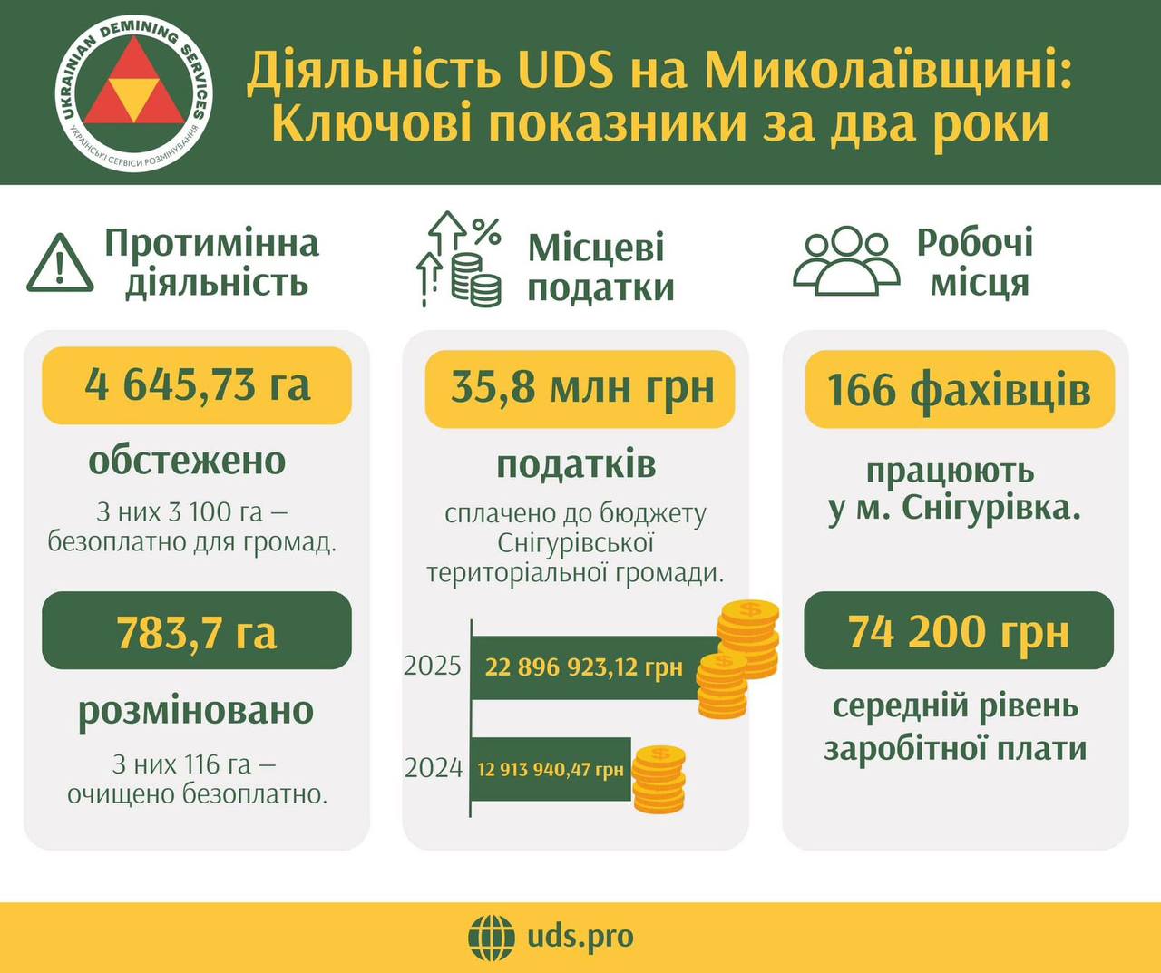 Окрім цього, в «Українські сервіси розмінування повідомили, що сплатили до бюджету Снігурівської територіальної громади 35,8 мільйонів гривень, що майже на 10 мільйонів більше, ніж торік.