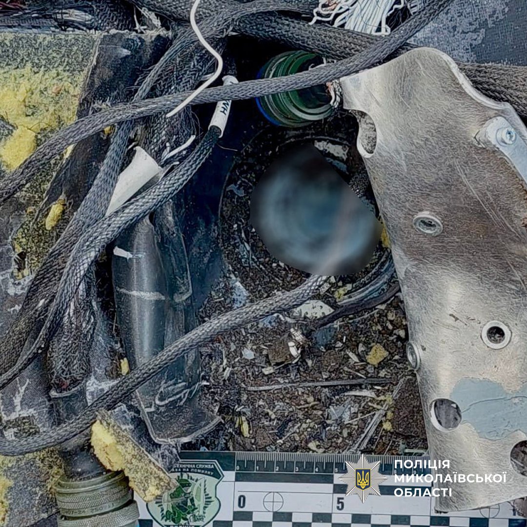 На Миколаївщині вибухотехніки знищили нездетоновану бойову частину російського дрона. Фото: поліція МиколаївщиниУ Миколаївській області поліцейські вибухотехніки знайшли та знешкодили бойову частину російського безпілотника, яка не здетонувала після падіння.