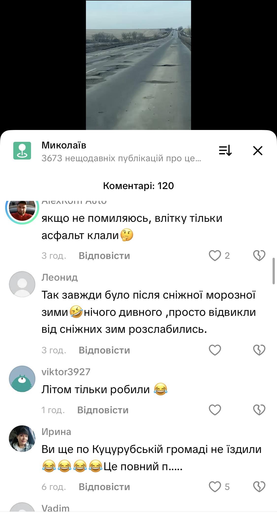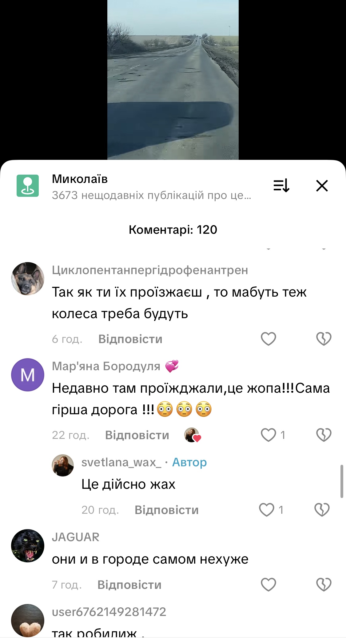 — Миколаївські дороги завжди такі. Немає якості, — скажиться ще одна користувачка TikTok Алла.