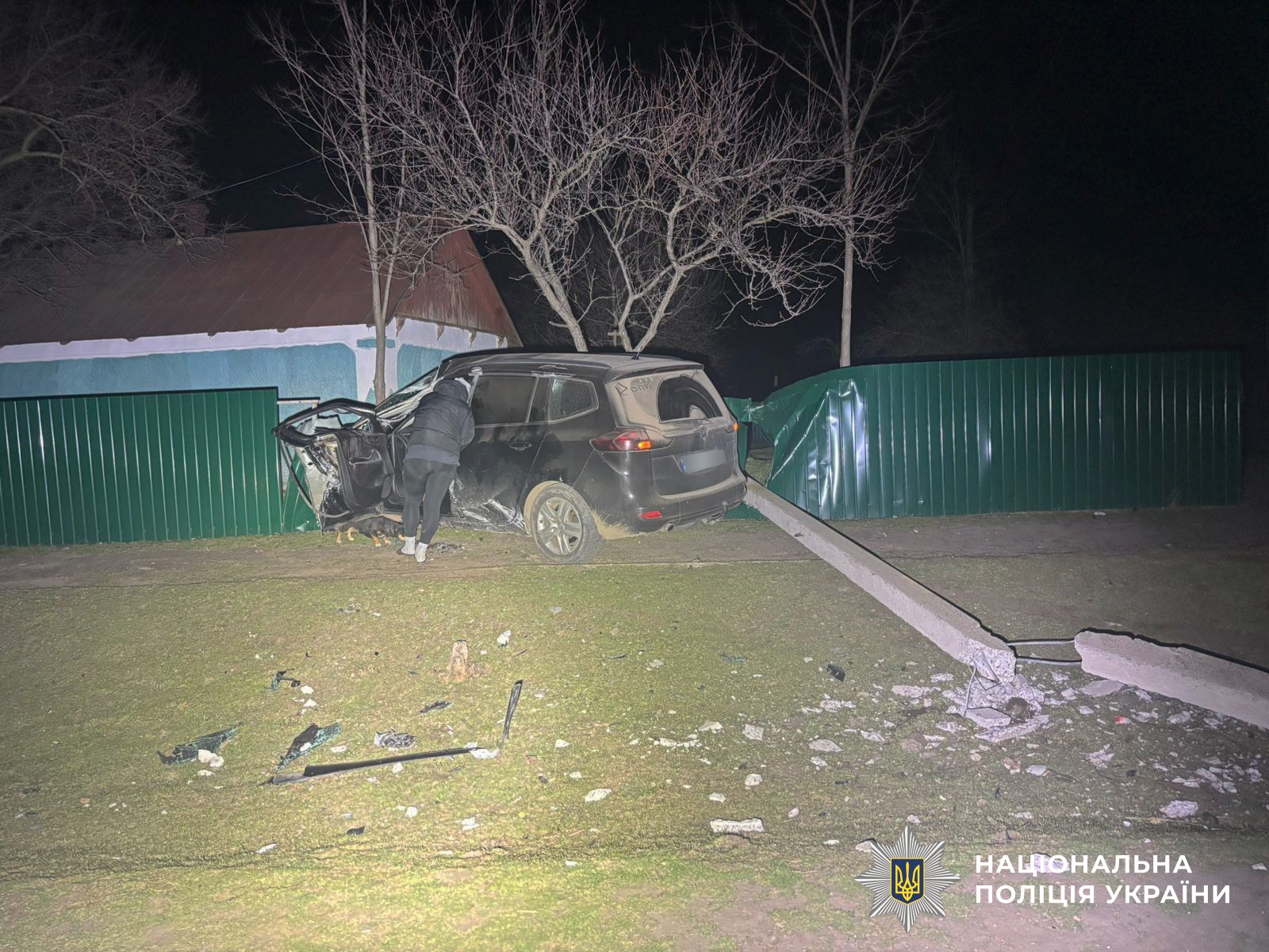 Фото: НацполіціяНа Миколаївщині водій Opel загинув, врізавшись у стовп та огорожу. Фото: Нацполіція