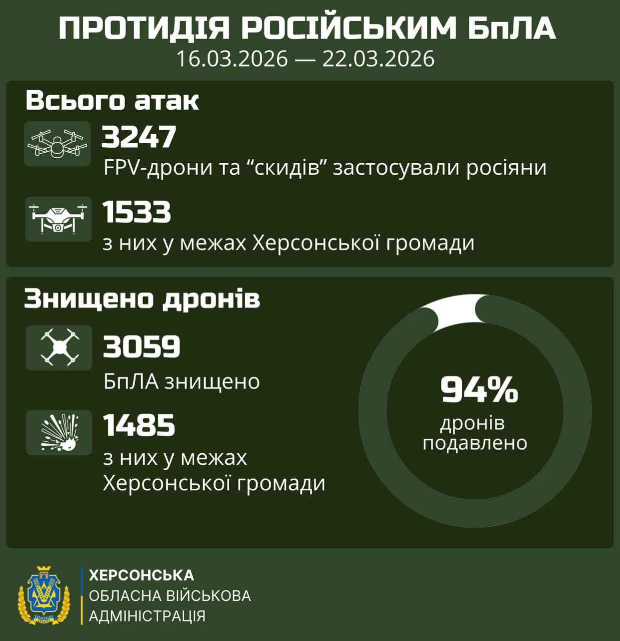 Понад 3 тисячі дронів за тиждень: ППО Херсонщини знищує 94% цілей