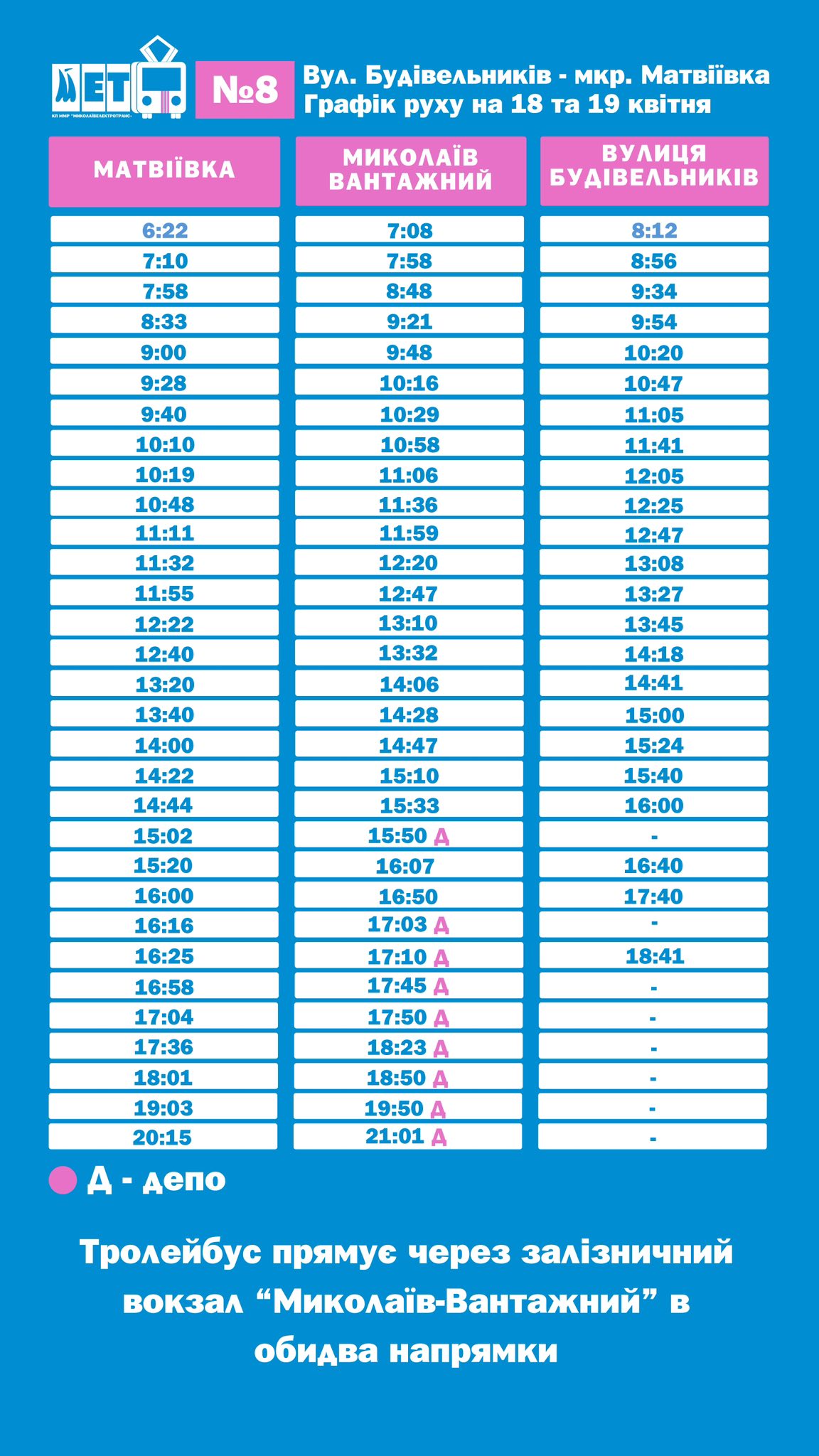 Зокрема, 18 та 19 квітня тролейбуси маршруту №8, що курсують між вулицею Будівельників та Матвіївкою, працюватимуть за спеціальним графіком: