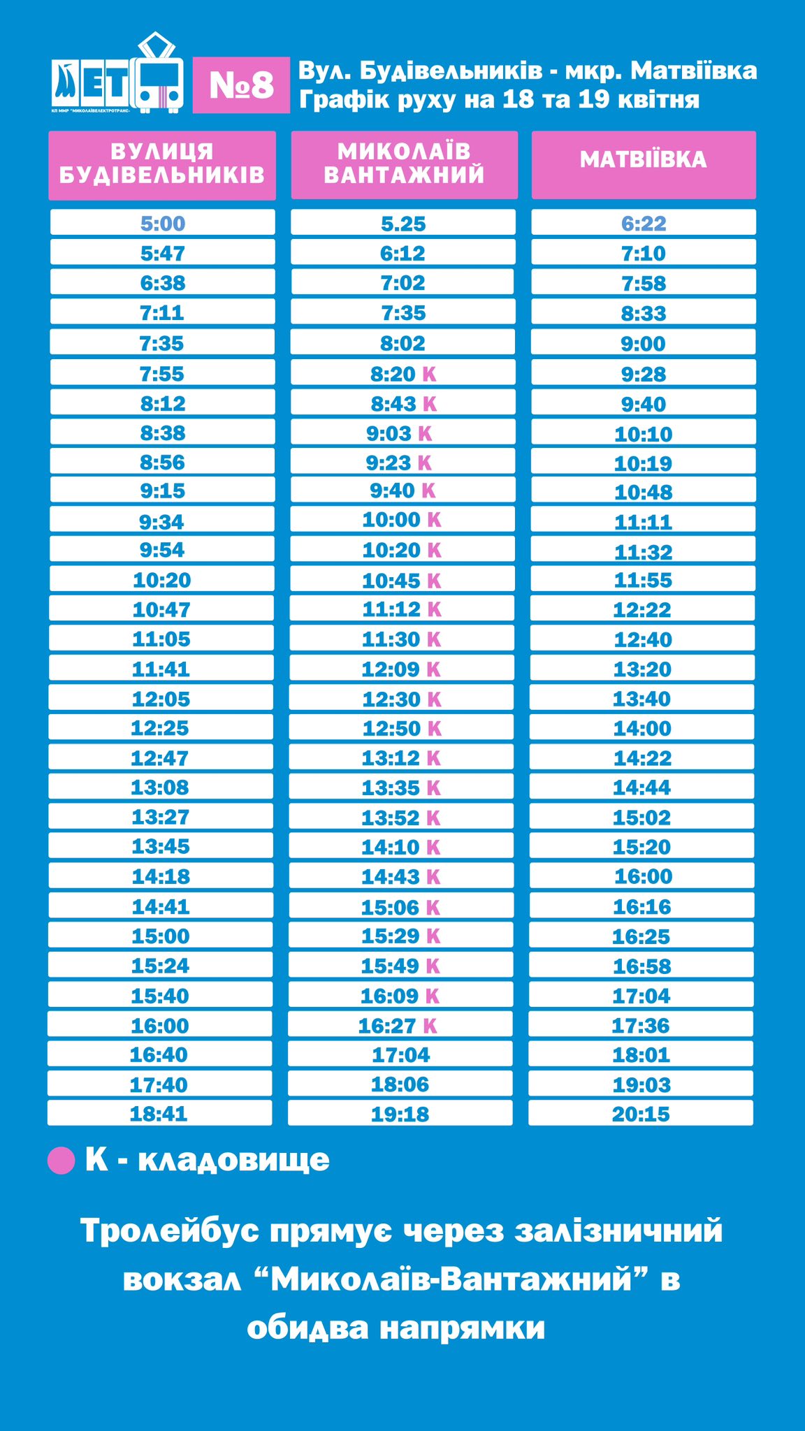 «Тролейбуси маршруту №8 (вул. Будівельників - Матвіївка) працюватимуть за опублікованим графіком для того, щоб забезпечити менший час очікування транспорту для тих, хто планує відвідати Матвіївське кладовище. Додатково звертаємо увагу пасажирів, що вказані графіки будуть діяти лише у зазначені дні», — йдеться у повідомленні.