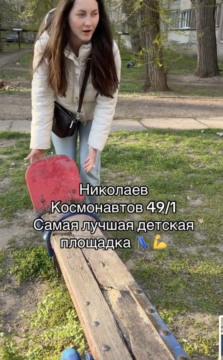 — Суперкрута гойдалка: поламана, убита, вмираюча, нещасна гойдалка. В принципі, як і все на нашому майданчику в Миколаєві. І я дякую вам, уряде. Дякую вам, наш мере, за такі «прекрасні» майданчики у Миколаєві. Найкраще місто.