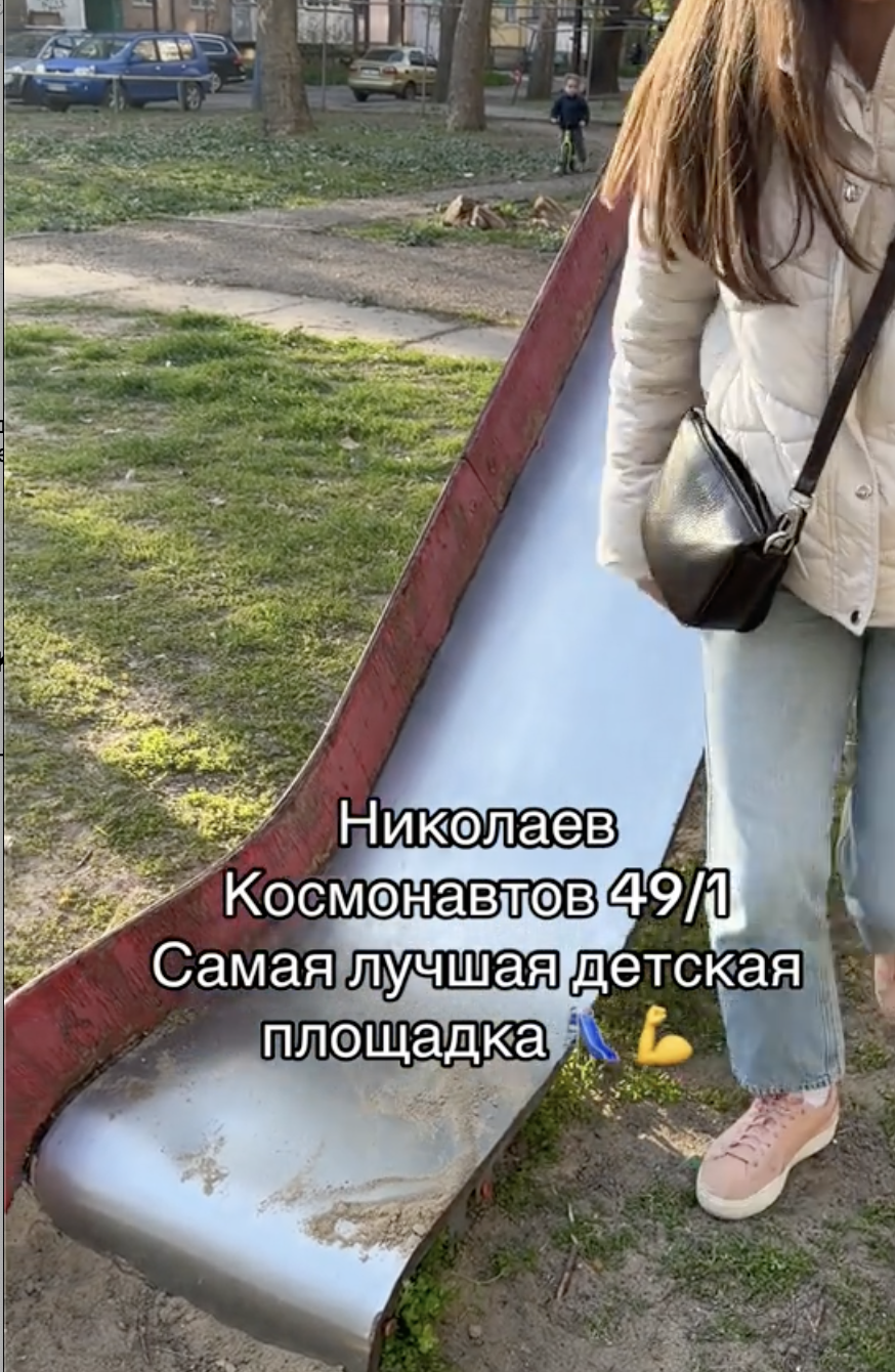 — Найкращі майданчики у нас у Миколаєві: погризені, поламані, побиті, подерті, засрані дитячі майданчики. Гірка називається «Самогубця». Хочеш покататися? Дивись, не втрать ногу, — поскаржилась місцева жителька.