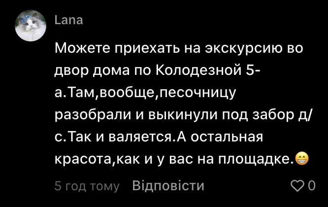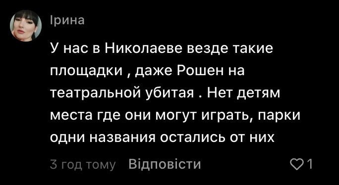 Зазначимо, що звернення до групи Contact Center при Миколаївській міській раді щодо цього майданчика наразі не надходило. Як зазначила сама авторка відео в коментарях під дописом, «це все довго».