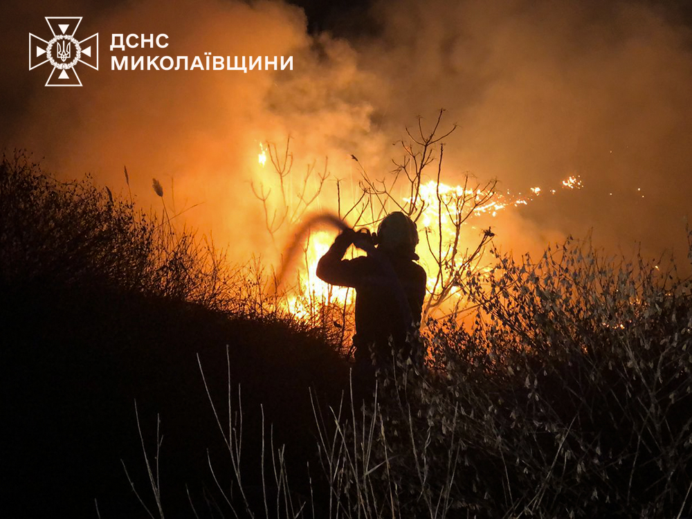 Як повідомили в ДСНС України у Миколаївській області, горіли очерет, суха трава, чагарники та шини.