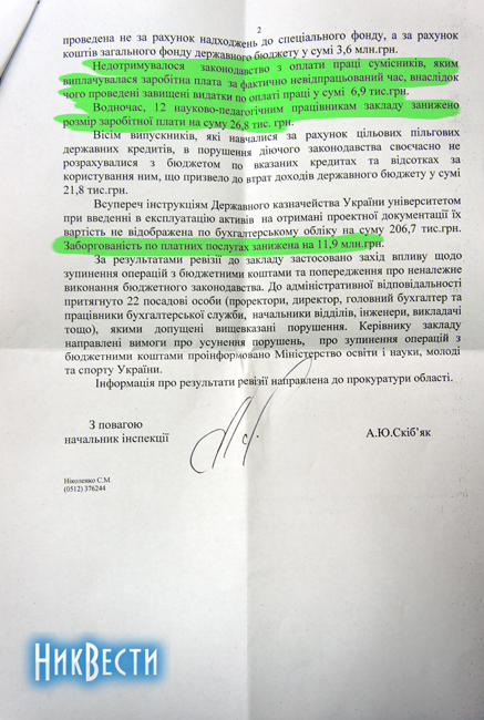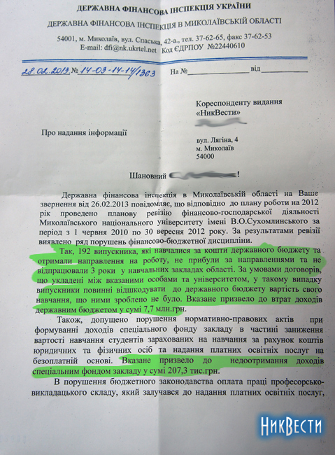 В частности, как говорится в ответе, Госфининспекция провела плановую ревизию финансово-хозяйственного деятельности Николаевского национального университета им. В. А. Сухомлинского за период с первого июня до 30 сентября 2012 года.