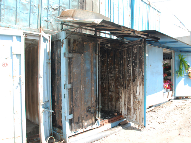 Огнем уничтожен товар, который хранился в контейнере. Причиной пожара стало нарушение правил пожарной безопасности при проведении электрогазосварочных работ.
