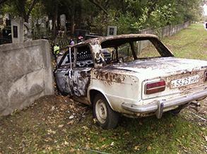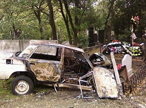 По прибытию на место происшествия спасатели немедленно начали тушить горящую машину. Автомобиль врезался в забор кладбища, но в кабине никого не было.
