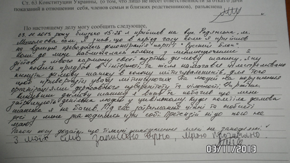 В это же время в Центральный райотдел милиции обратилась участница вышеупомянутого шествия. Женщина сообщила, что в тот момент, когда она находилась на углу улиц Советской и Адмиральской, неизвестный бросил дымовую шашку с едким дымом, от действия которой ей стало плохо, и написала заявление о принятии мер реагирования к правонарушителям.