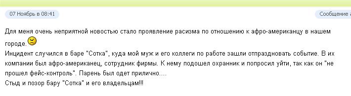 — Инцидент случился в баре «Сотка», куда мой муж и его коллеги по работе зашли отпраздновать событие. В их компании был афроамериканец, сотрудник фирмы. К нему подошел охранник и попросил уйти, так как он «не прошел фейсконтроль». Парень был одет прилично, - сообщают пользователи форума