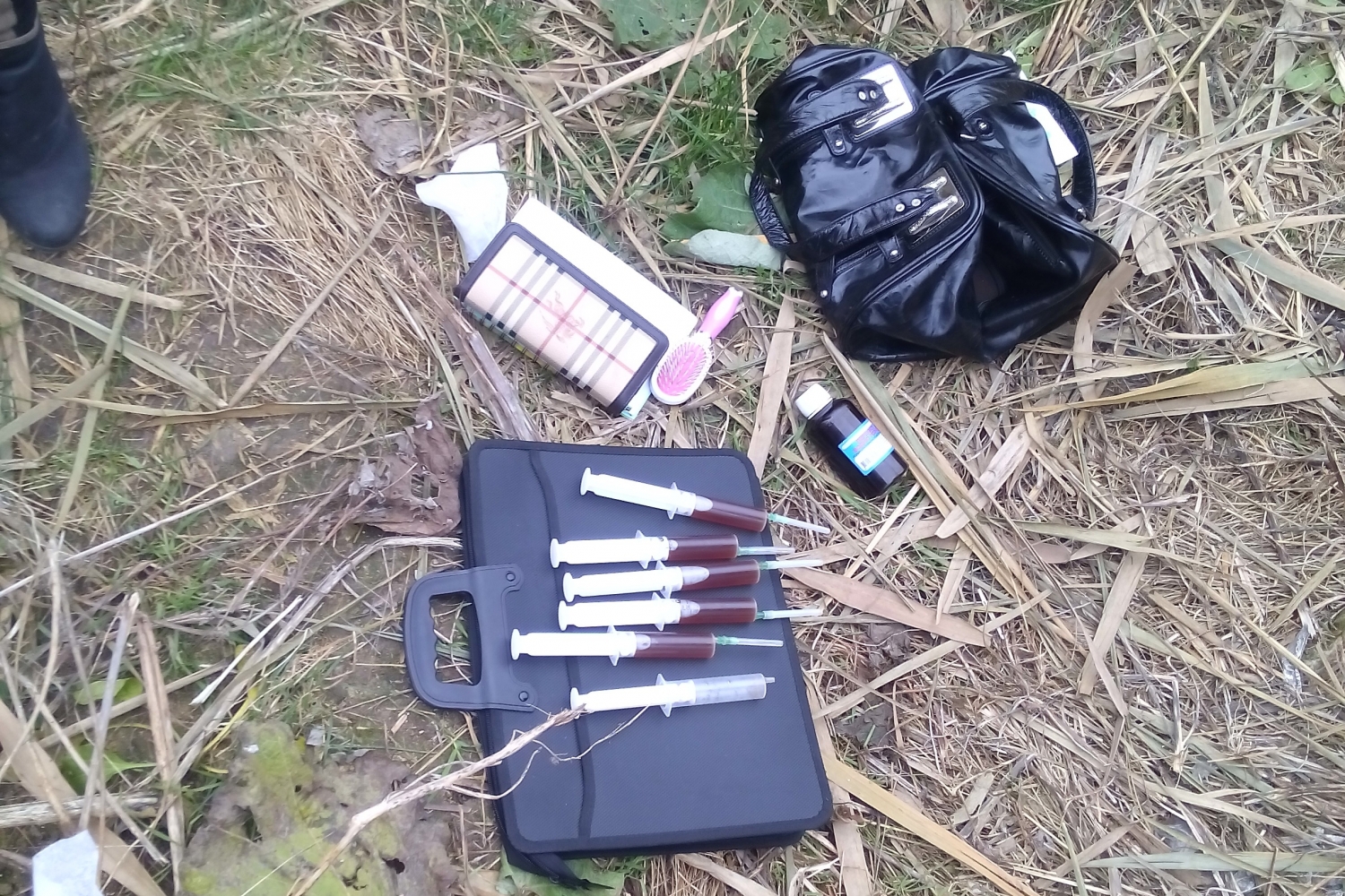 В ходе проведения осмотра на берегу реки возле гражданки, которая назвалась Евдокимовой Анной Владимировной, 10 апреля 1981 года рождения, была обнаружена женская сумочка черного цвета, в которой находились 5 медицинских шприцов объемом по 20 мл, наполненных светло-коричневой жидкостью. Еще в одном таком шприце находились остатки жидкости светло-коричневого цвета. Также была обнаружена пластиковая бутылка объемом 200 мл с надписью «Перекись водорода. Раствор», в которой находилась такая же жидкость светло-коричневого цвета.