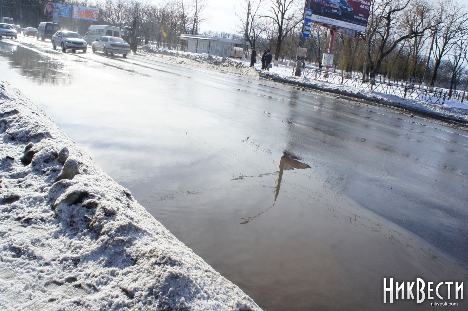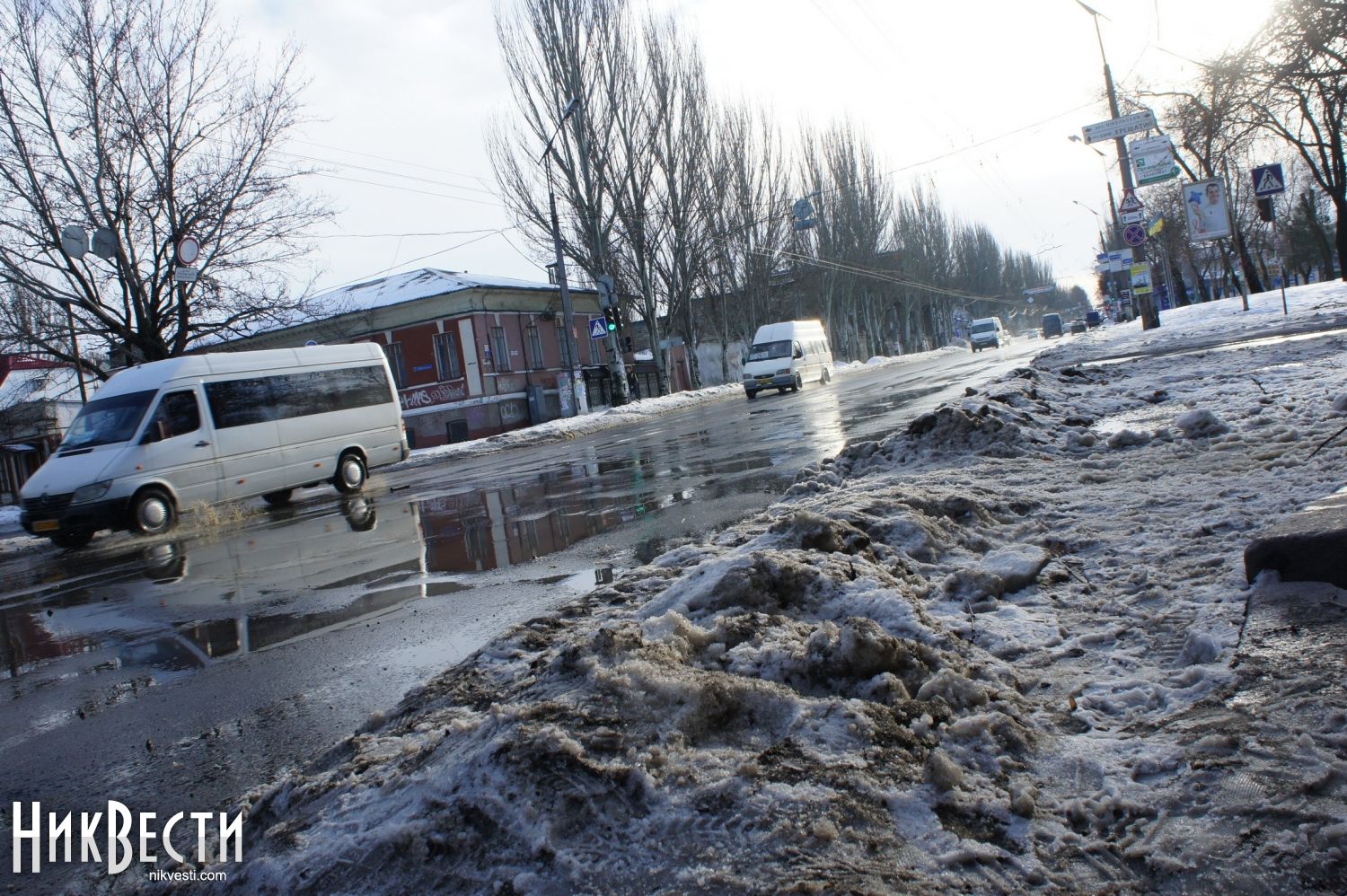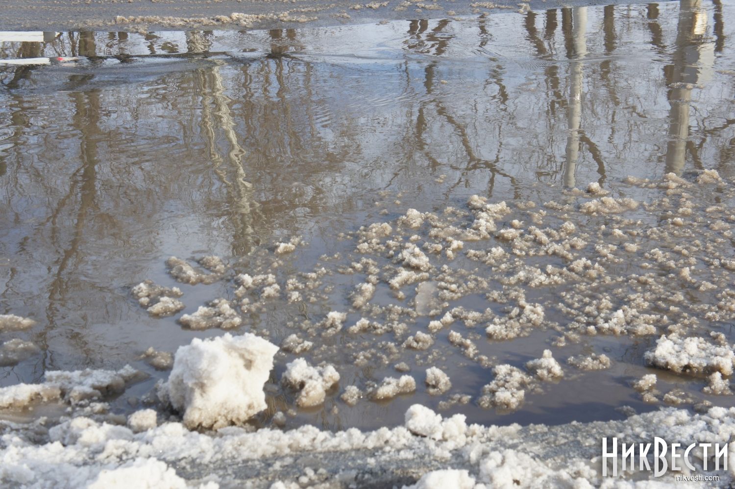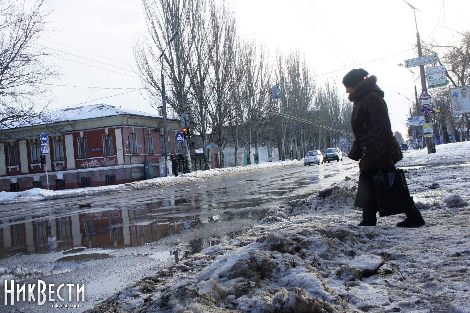 Плюсовая температура ускорила таяние снега, выпавшего в огромном количестве накануне новогодних праздников. Практически весь Николаев оказался залит лужами растаявшего подарка зимы. Несмотря на это, коммунальные службы приступать к уборке не торопятся.