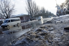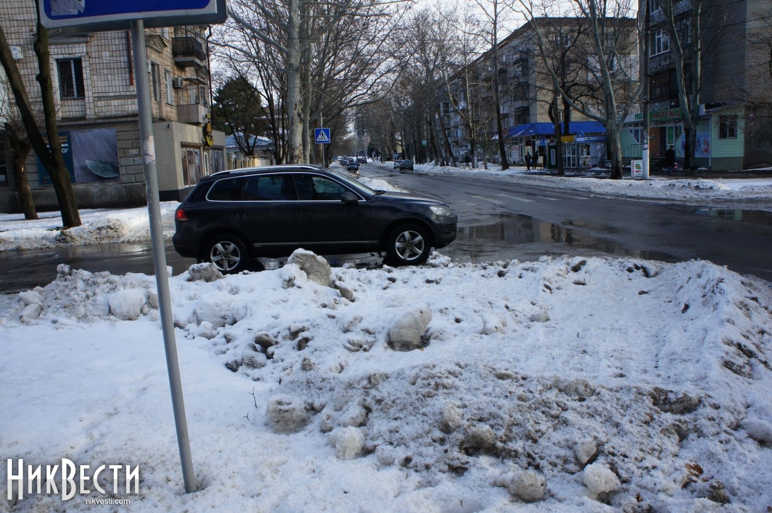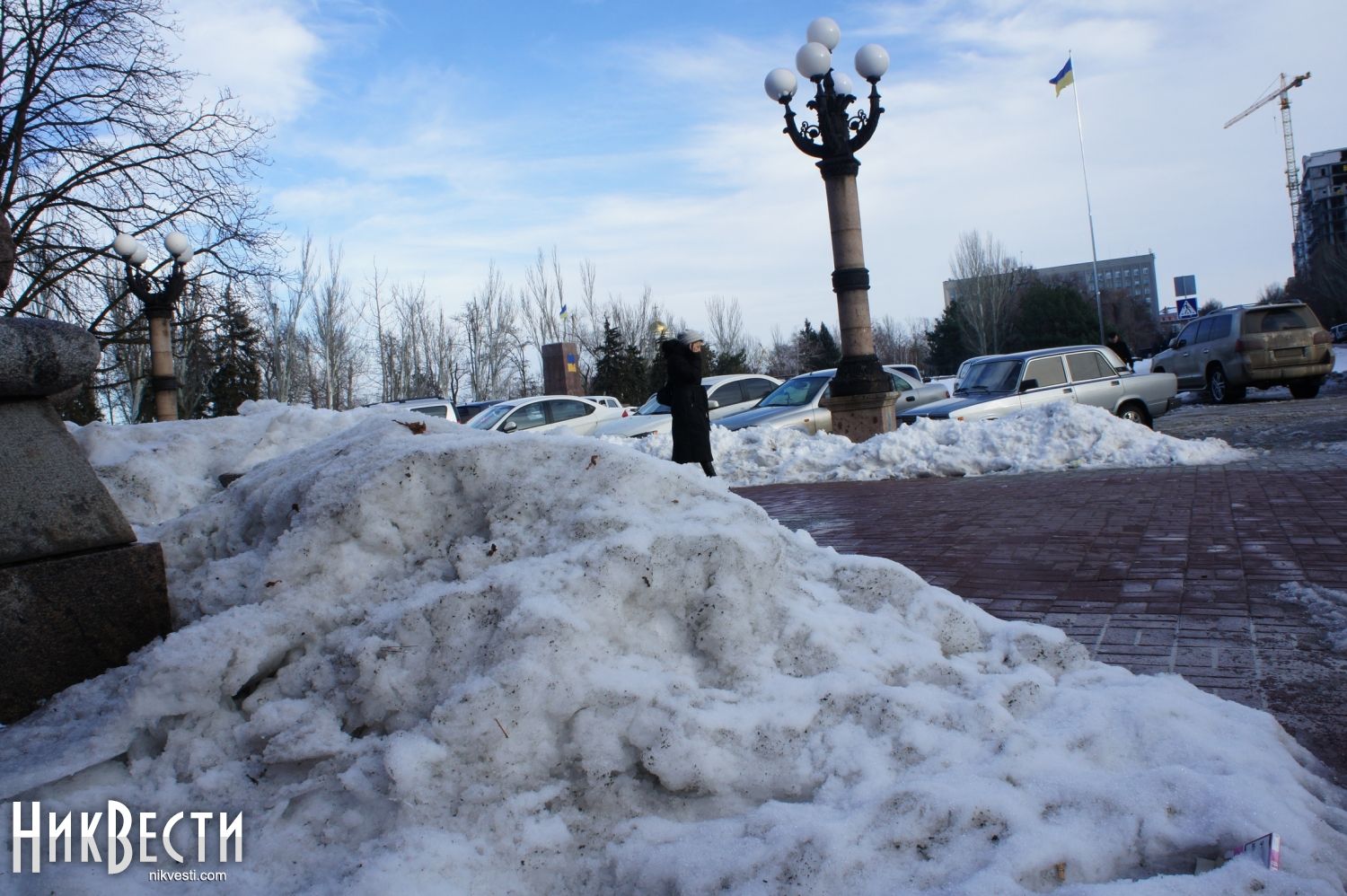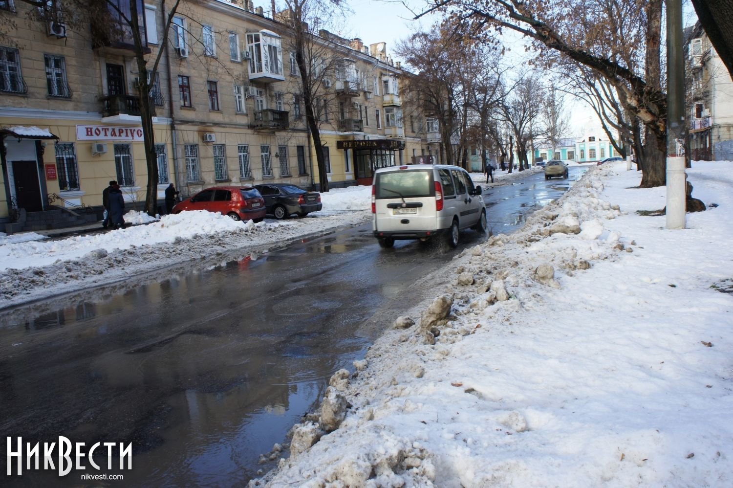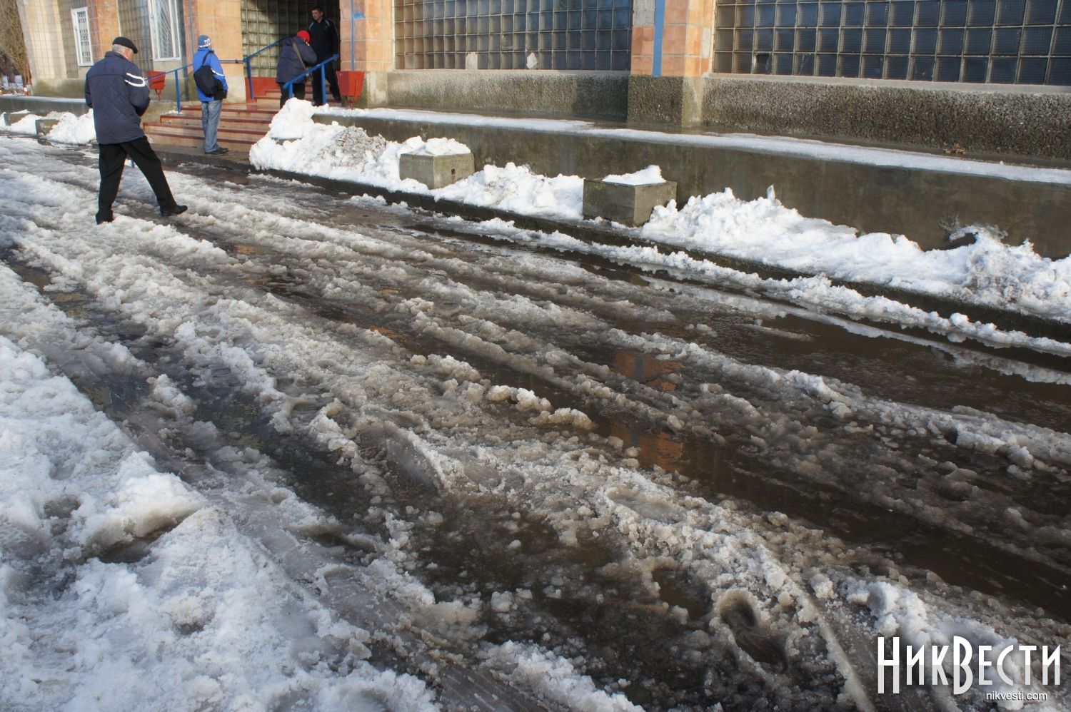 Плюсовая температура ускорила таяние снега, выпавшего в огромном количестве накануне новогодних праздников. Практически весь Николаев оказался залит лужами растаявшего подарка зимы. Несмотря на это, коммунальные службы приступать к уборке не торопятся.