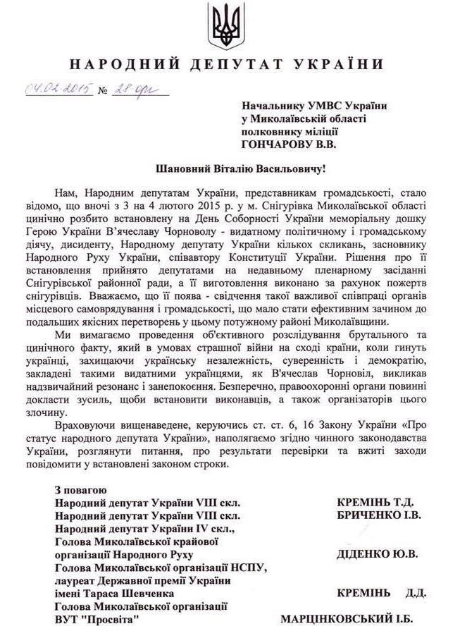 — Мы требуем проведения объективного расследования брутального и циничного факта, который в условиях страшной войны на востоке страны, когда гибнут украинцы, защищая украинскую независимость, суверенность и демократию, заложенные такими выдающимися украинцами, як Вячеслав Черновол, вызвал необычайный резонанс и беспокойство. Безусловно, правоохранительные органы должны приложить усилия, чтобы установить исполнителей и организаторов этого преступления, — сказано в письме.