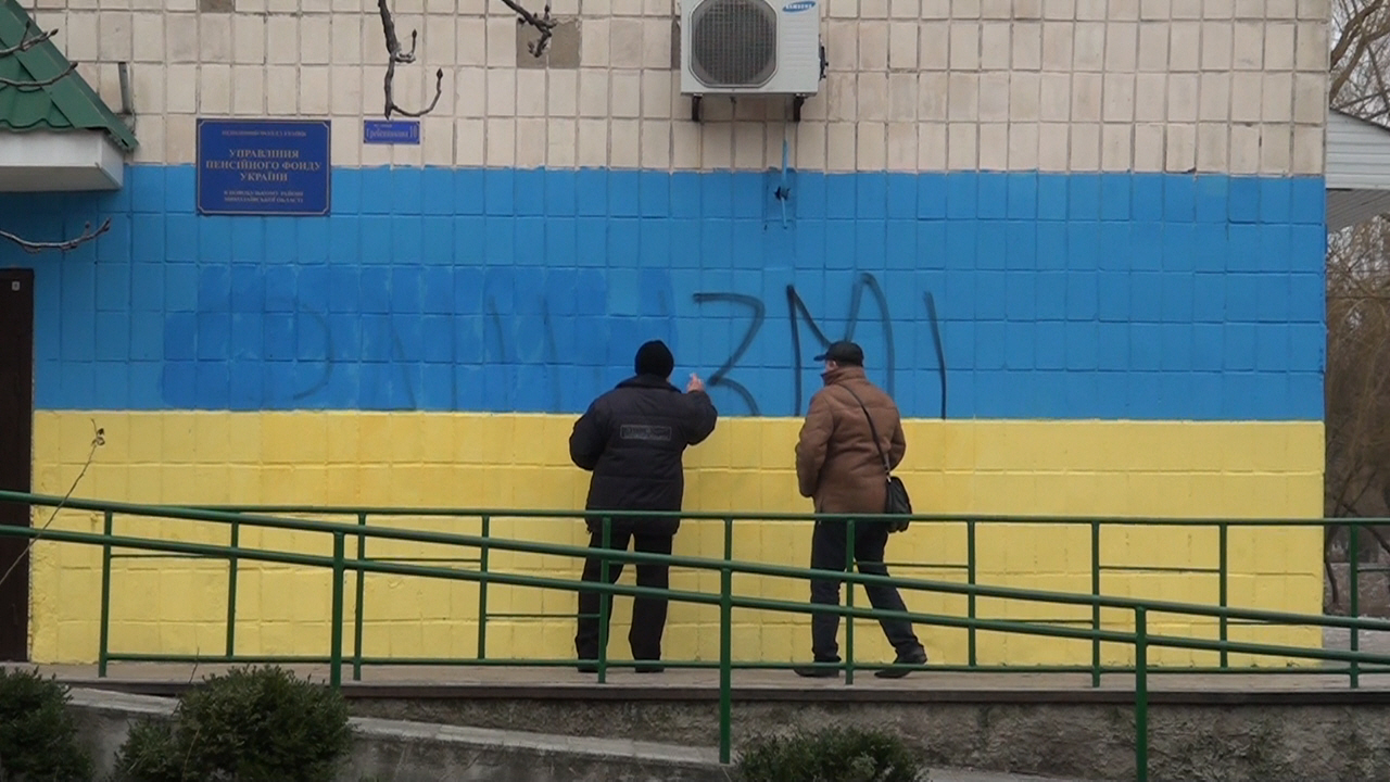 Сегодня ночью в Новом Буге Николаевской области неизвестные совершили акт вандализма – поставили свастику на флаге Украины, который был нарисован на фасаде районного управления Пенсионного фонда.