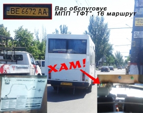 Сегодня в Николаеве водитель микроавтобуса на маршруте №16, номер авто – ВЕ6672АА, хамил пассажирам, отказывался высаживать пассажира, давшего крупную купюру, подбирал людей не на остановках, разговаривал по мобильному телефону и гонялся с другими маршрутчиками.