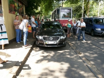 Сегодня в Николаеве водитель автомобиля Volkswagen Passat остановил машину по улице Потемкинской таким образом, что создал препятствие в движении для трамваев.