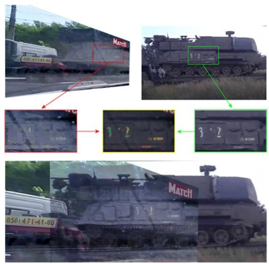 На снимках из России (справа) и Украины (слева), геолокацию которых удалось подтвердить Bellingcat, на «Буке 3х2» видны схожие погрузочные маркировки, сохранившиеся элементы номера и белая краска на щитке гусеницы в одних и тех же местах.