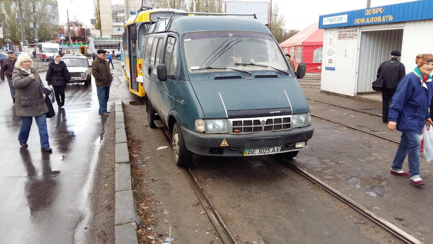 В четверг утром в Николаеве возле рынка «Колос» водитель «Газели» с госномером ВЕ3025АХ оставил свое транспортное средство прямо на трамвайных путях.
