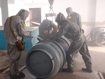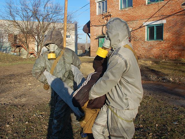 Следующим этапом учения стала ликвидация условной аварии на предприятии. Так, по легенде, на очистных сооружениях воды № 1 КП «Первомайский городской водоканал» при выполнении работ по перегрузке контейнера с хлором возникла авария и его разгерметизация. Из-за этого произошел выброс хлора в окружающую среду, 2 человека погибли, 5 пострадали. Кроме этого в зону заражения попали 125 человек, большей части которых грозит смертельная опасность.