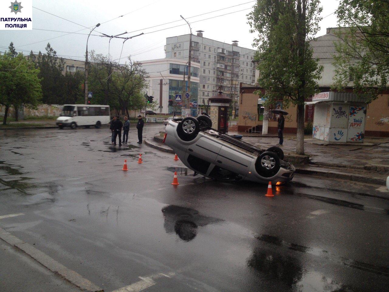В Заводском районе города Николаева, на пересечении улиц Крылова и Карпенко, водитель автомобиля «Renault Logan» не справился с управлением, и машина перевернулась на крышу.